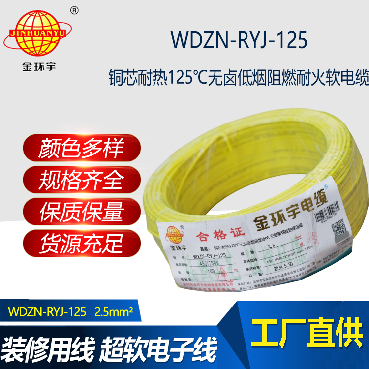 WDZN-RYJ-125低煙無鹵軟電線采用銅芯耐熱125℃無鹵低煙阻燃耐火交聯聚烯烴絕緣材料制成,適用于額定電壓450/750V及以下的固定布線和電力、電...