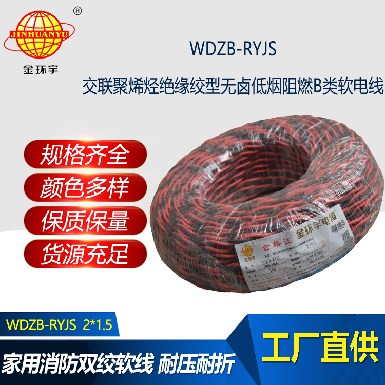 WDZB-RYJS:低煙無鹵交聯聚烯烴絕緣B類阻燃雙絞線;是消防用低煙無鹵阻燃聚烯烴絕緣連接軟線是參照GB/T5023-2008等標準制訂的,其耐火特性符合GB/Tl9666類的要求。